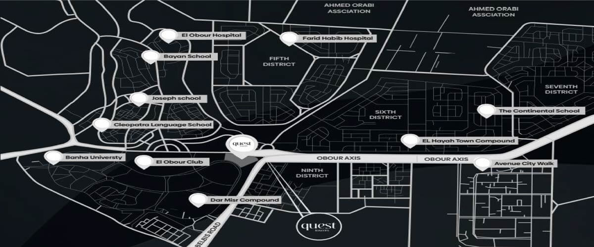 Quest Towers Obour City is a mixed-use project that includes residential units, besides different types of commercial units. Where you can live and invest, as well as it is in a huge project, (Quest City Obour, which means it is in a vital area where owners can benefit from being in a prime location like this.